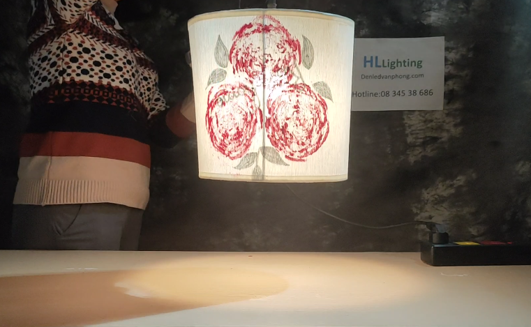 Những bông hồng đang hé nở được ánh đèn chiếu sáng một cách ấm áp thông qua lớp vải Hà Đông, các quan khách đi qua cũng không thể thờ ơ trước vẻ đẹp đó mà phải dừng lại vài phút giây để ngắm nhìn sản phẩm đèn thả trần cao cấp tuyệt vời này